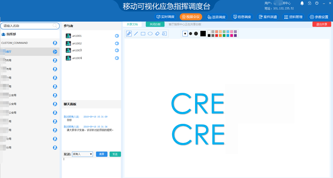 考虑单位指导精神的传达、工作汇报、岗位培训等,在视频会议的中,仅仅看到人员和听到会场声音是不够的,会场外的人员无法看到指导文档、汇报材料、培训的内容等书面材料,也因此在应急指挥调度平台开发了文档共享功能。在平时,可以共享最新的指导性文件,供其它人员在调度台上或是前端设备上直接查看;在视频会议的同时可以插入文档,进行实时的指导讲解或是汇报,更加贴近现实工作会议,高效,高质的实现文档共享。